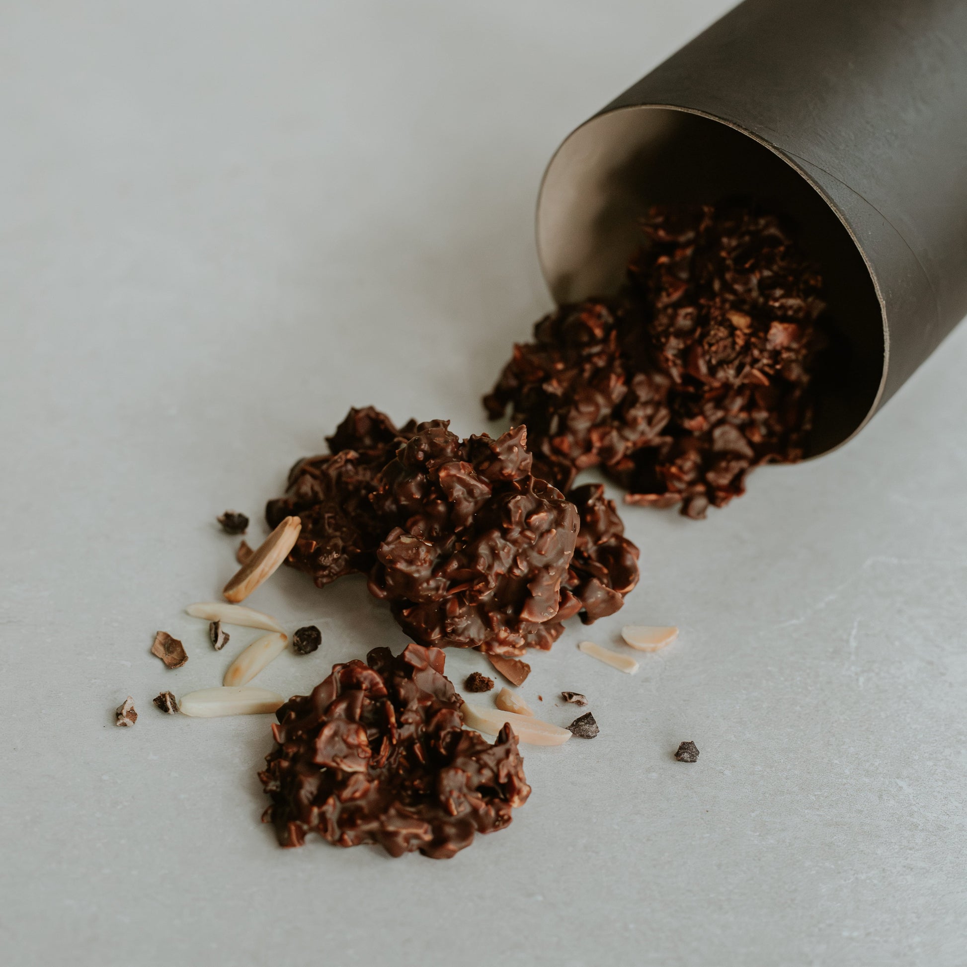 Amêndoas tostadas, avelãs e uva passa banhados em chocolate 60% cacau. 100g.